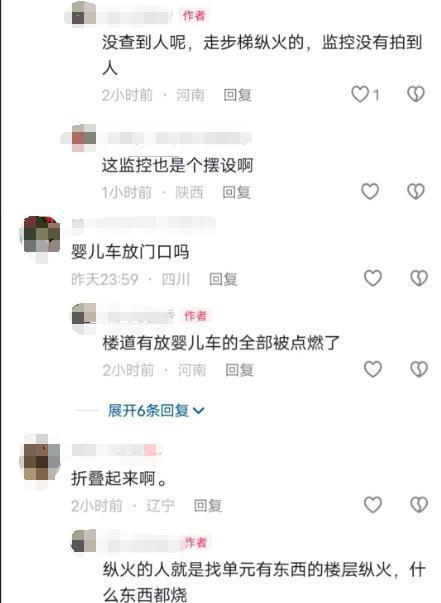 视频中可见,失火单元楼道的墙体已被熏黑,顶部墙皮也因大火而出现脱落,过道旁还有被烧毁的物品灰烬。该视频发布者在评论区留言称,其所在单元一共有三层被人为纵火,“(纵火者)走步梯纵火的,监控没有拍到人。纵火的人就是找单元有东西的楼层纵火,什么东西都烧。”